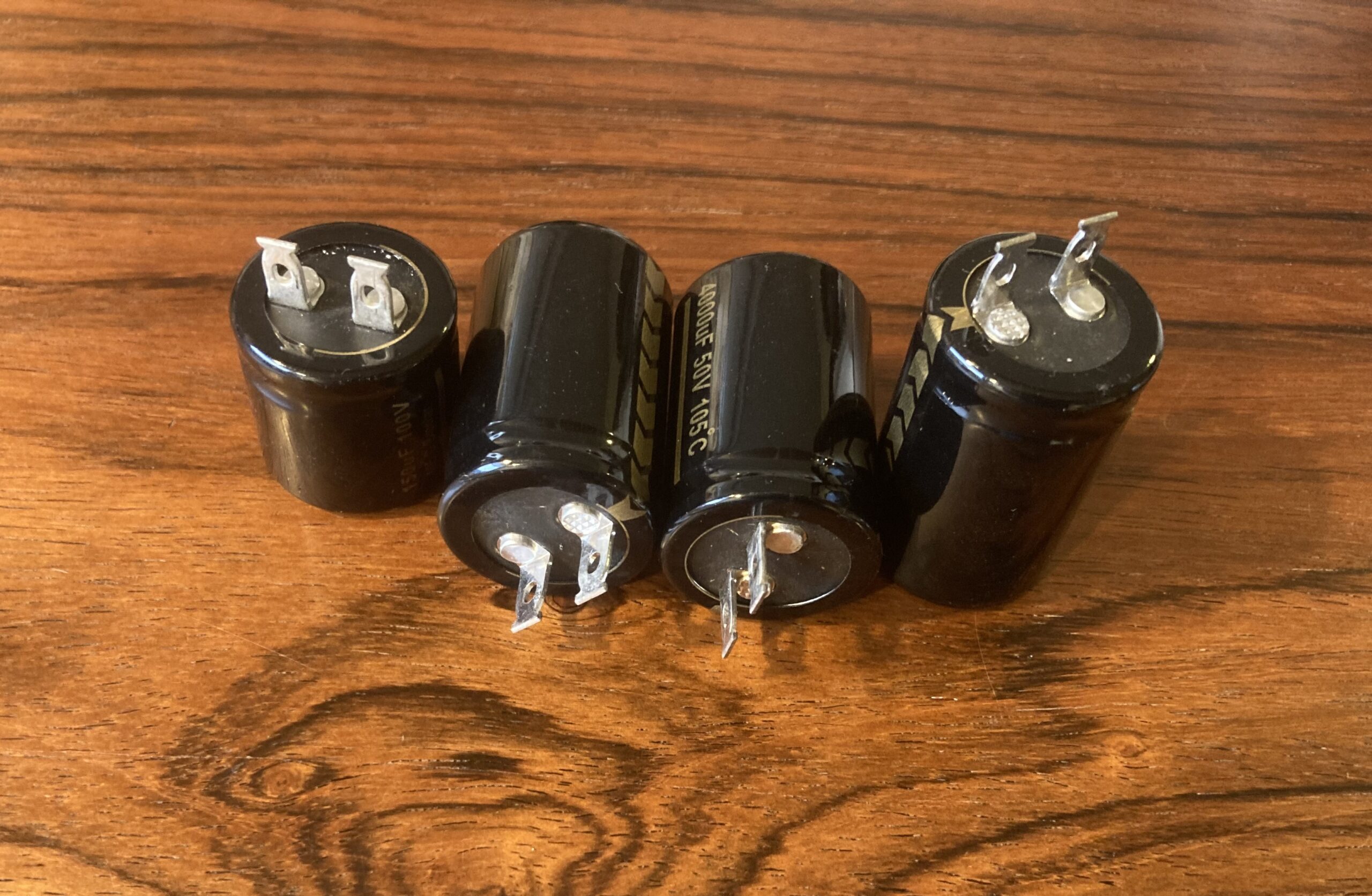 – The two large 3000uF (occasionally 4000uF) 50V filter capacitors and the 2000uF (occasionally 3000uF) 25V capacitor for the motor circuit are all replaced by new 4000uF 50V electrolytic capacitors with correct solder lug terminals, custom produced to correct diameter to fit in the holder.